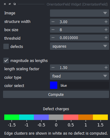 <img-name> - nematic fieldcontains the nematic field as oriented bars spaced out according to the selected box size.<img-name> - edge clusterscontains the areas of low nematic magnitude that touch an edge. These are in white, you should make sure no area of interest is in one of these clusters because we do not provide any information about these areas (computing a defect charge is impossible without edge information).<img-name> - clusterscontains the other areas of low magnitude. Some of these are not defects, you will know this when the cluster is colored in grey, which corresponds to a charge of 0. A color mapping of charges from -1.5 to +1.5 is always on display on the widget.<img-name> - points defectscontains the defects found in the intersection of boxes, as defined in the widget parameters. By construction, these can only ever be -0.5 or +0.5.